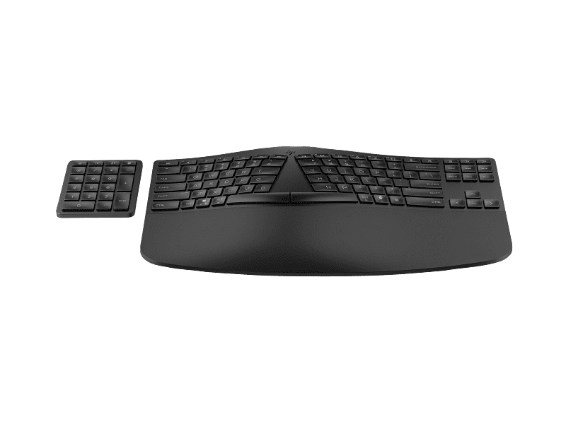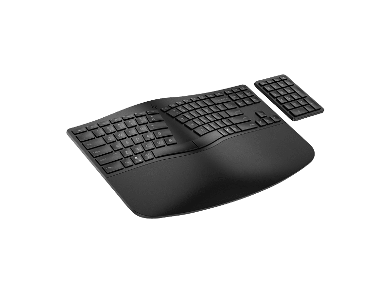 המקלדת HP 965 מציגה עיצוב ארגונומי מתקדם: פריסה מפוצלת (Split‑zone) ו‑negative tilt שמפחיתות עומסים על האמות וסטייה של פרקי כף היד. Keycaps המעוצבים להתאמה טבעית לאצבע ומשענת יד רחבה עם ספוג בצפיפות גבוהה מספקים נוחות לאורך יום עבודה שלם. ה‑numpad האלחוטי הנפרד מאפשר מיקום גמיש ושומר על שולחן עבודה מסודר.